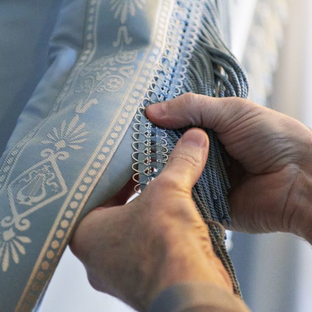 Tapissier posant un galon sur le rideau du dais. Le Château de Rambouillet est un joyau de notre patrimoine yvelinois. L’entreprise mandatée par le Centre des monuments nationaux pour réaliser ces travaux est, quant à elle, l’héritière d’une longue lignée de tisserands. Soutenir ce projet, c’est contribuer au rayonnement de notre région et de notre histoire et c’est aussi encourager la transmission de savoir-faire ancestraux à de jeunes talents d’excellence.