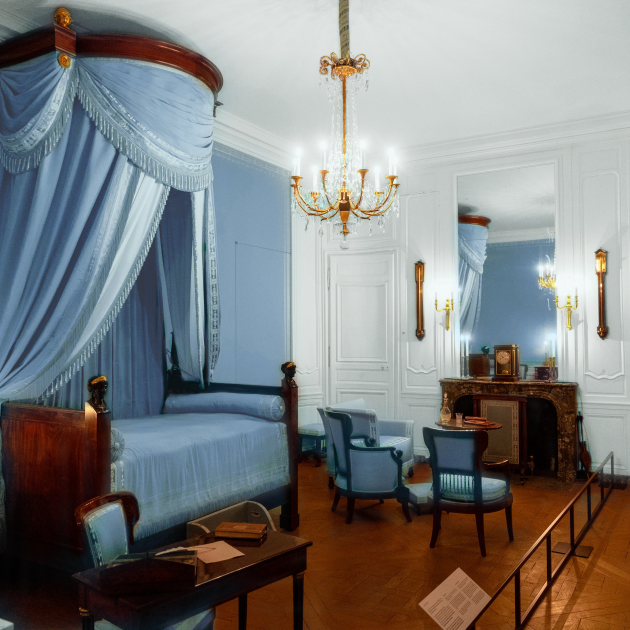 Un des projets majeurs était de recréer la chambre de Napoléon comme elle était en 1807, avec sa couleur bleue caractéristique. Les anciennes tapisseries ayant été retirées des appartements, il a fallu opérer une restitution*.