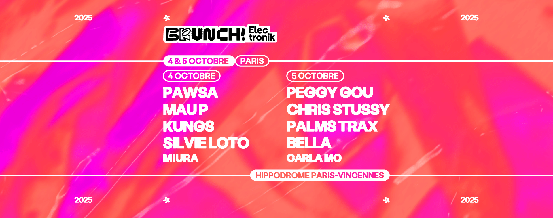 Le Brunch Electronik est de retour à Paris à l’Hippodrome Paris-Vincennes, les 4 et 5 octobre 2025 ! Que vous soyez passionnés d’électro, adeptes des line ups imposants qui font vibrer la foule, ou juste, curieux de découvrir une ambiance festive inédite, nous vous donnons RDV pour profiter des sets des meilleur.e.s artistes électro du moment :